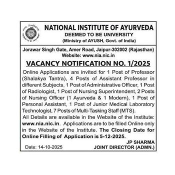 Job Code : 7 Vacancy for Various AYUSH posts, National Institute of Ayurveda, Jaipur.