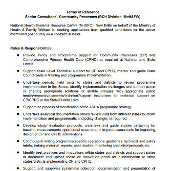 Job Code : 14 Vacancy for the post of Senior Consultant - Community Processes (AYUSH), National Health Systems Resource Centre, New Delhi.