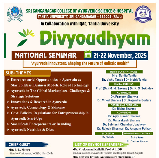 DIVYOUDHYAM: National Seminar on "Ayurveda Innovators: Shaping the Future of Holistic Health", Organized by Sri Ganganagar College of Ayurvedic Science and Hospital, Rajasthan.