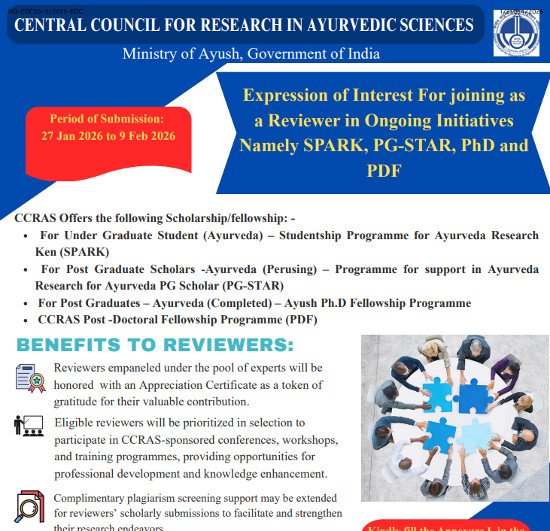 Expression of Interest for Joining as a Reviewer in Ongoing Initiatives Namely SPARK, PG-STAR, PhD and PDF, Organized by Central Council for Research in Ayurvedic Sciences, Delhi.