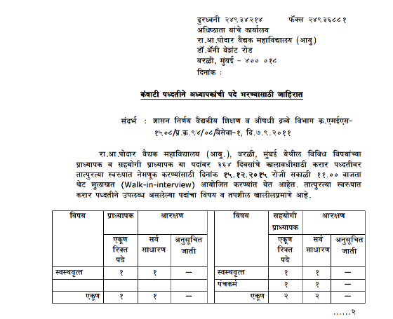 Walk-in-interview for the post of Associate Professor and Professor, R. A. Podar Ayurved Medical College, Worli, Mumbai.