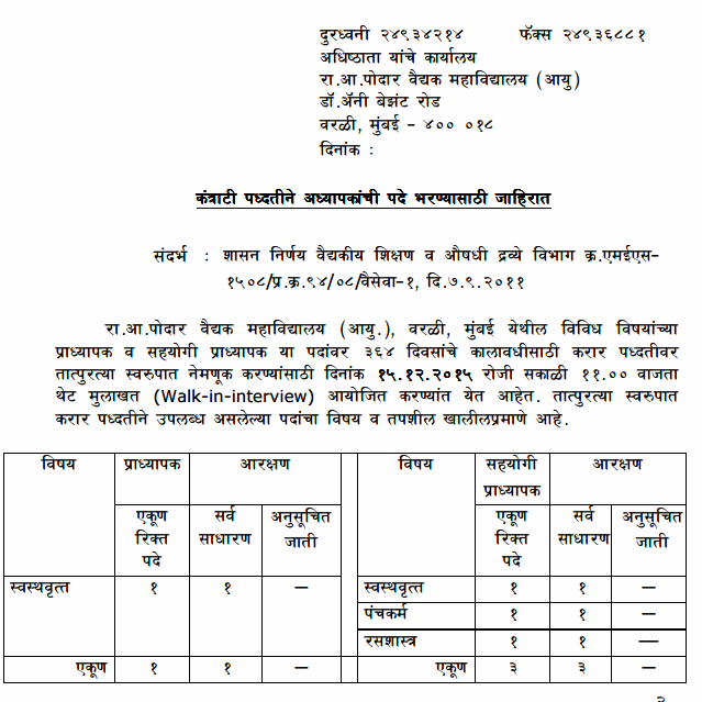 Revised Advertisement for Walk-in-interview for the post of Associate Professor and Professor, R. A. Podar Ayurved Medical College, Worli, Mumbai.