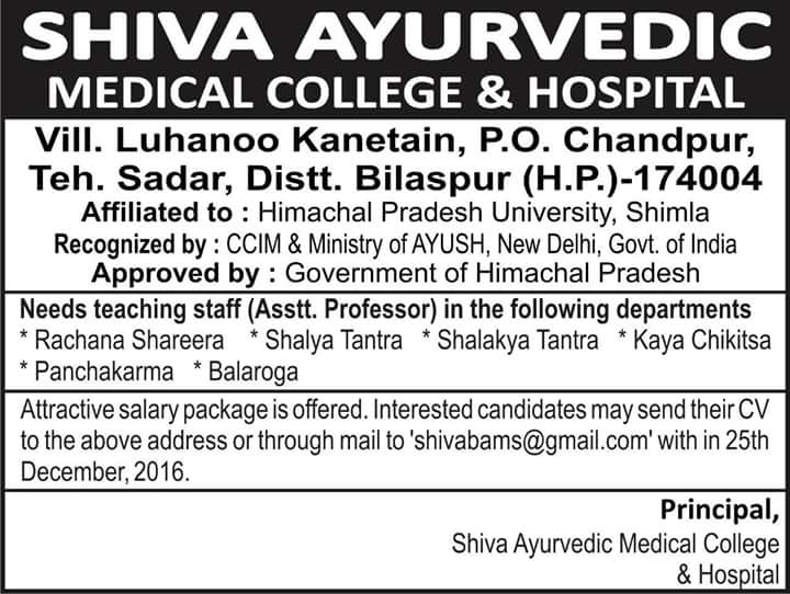 Vacancy for the post of Assistant Professor at Shiva Ayurvedic Medical College & Hospital, Bilaspur.