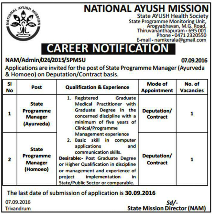 Vacancy for the post of State Programme Manager (Ayurveda) at National Ayush Mission.