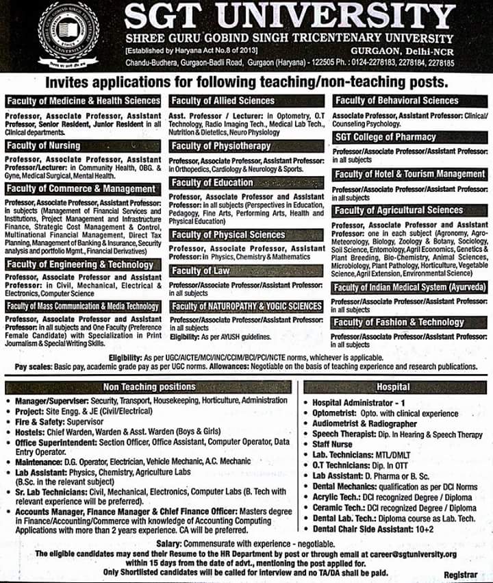 Vacancy for the posts of Teaching and Non-Teaching Staff at SGT University, Delhi.