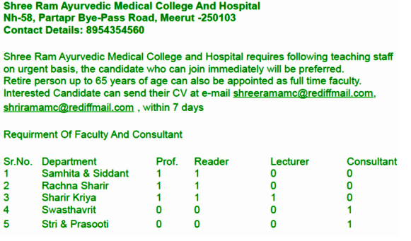 Vacancy for the post of Teaching Faculty at Shree Ram Ayurvedic Medical College & Hospital, Meerut.