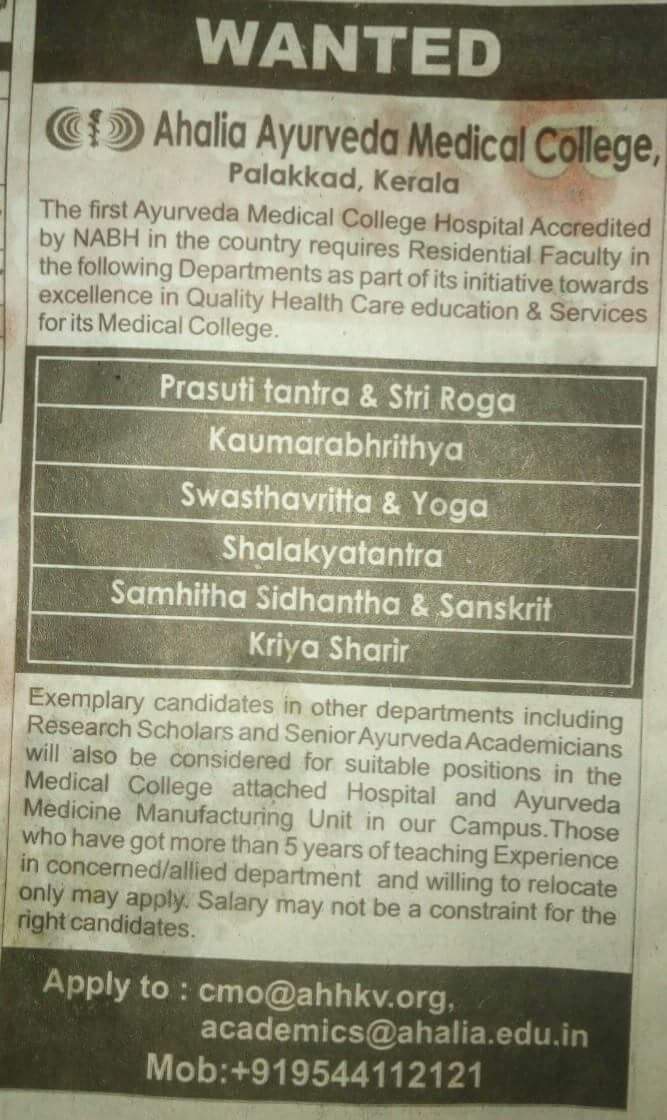 Vacancy for Various Posts at Ahalia Ayurveda Medical College, Kerala.