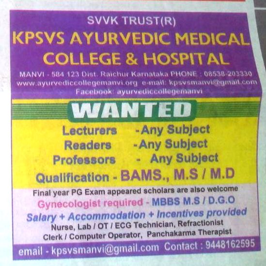Vacancy for the posts of Professors, Readers and Lecturers at KPSVS Ayurvedic Medical College, Raichur.