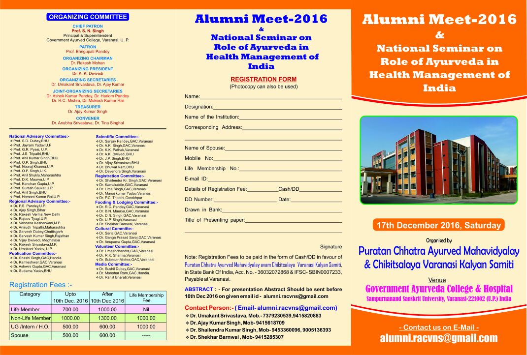 Alumni Meet-2016 & National Seminar on Role of Ayurveda in Health Management of India, organized by Puratan Chhatra Ayurved Mahavidyalaya & Chikitsalaya Varanasi Kalyan Samiti.