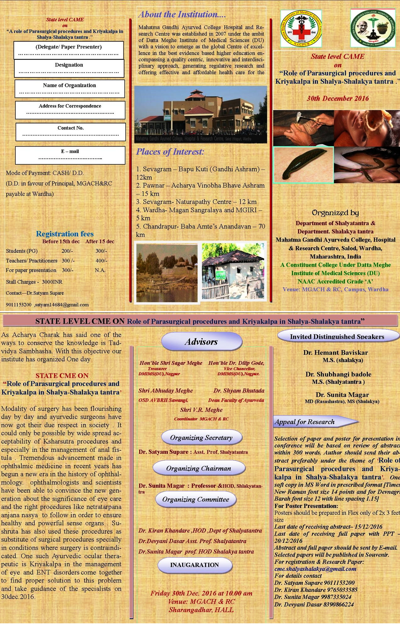 State Level CME on "Role of Parasurgical Procedures and Kriyakalpa in Shalya-Shalakya Tantra", organized by Mahatma Gandhi Ayurved College, Hospital & Research Centre, Wardha.