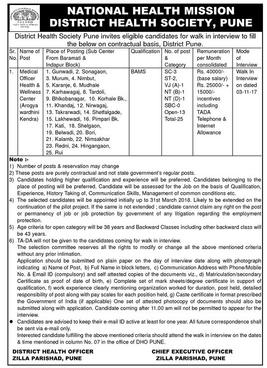 Walk in Interview for the post of Medical Officer Health & Wellness Center at National Health Mission, Pune.