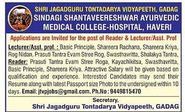Vacancy for the post of Reader, Lecturer and asst Professor at Sindagi Shanthaveereshwara Ayurvedic Medical College, Haveri.