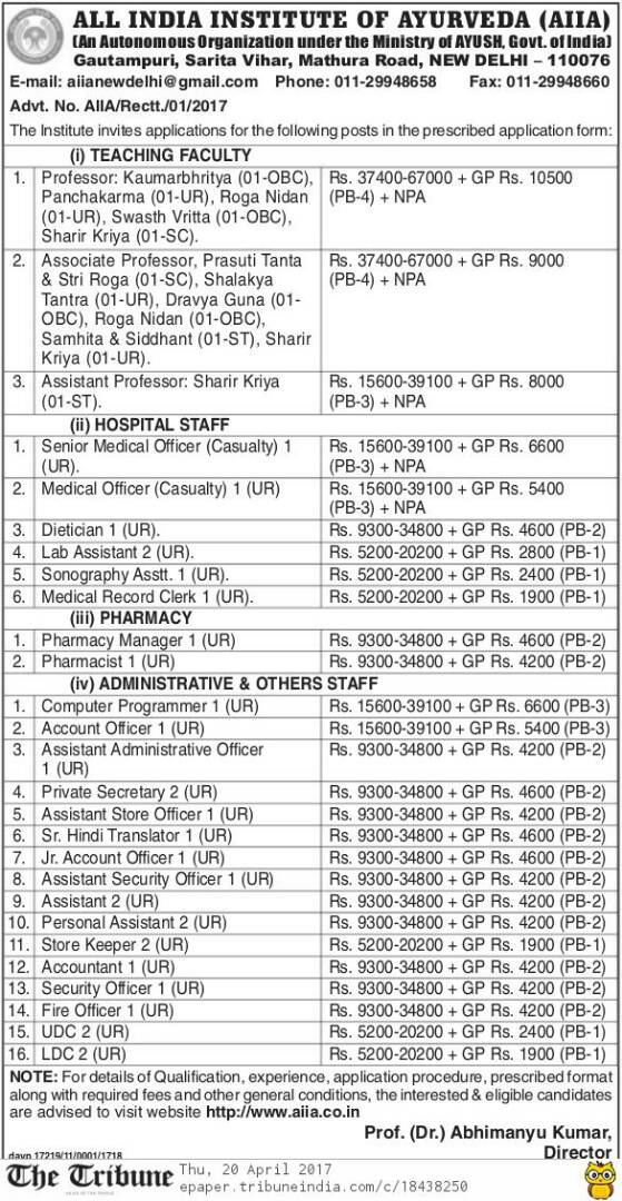Vacancy for the posts of Teaching Faculty at All India Institute of Ayurveda, New Delhi.