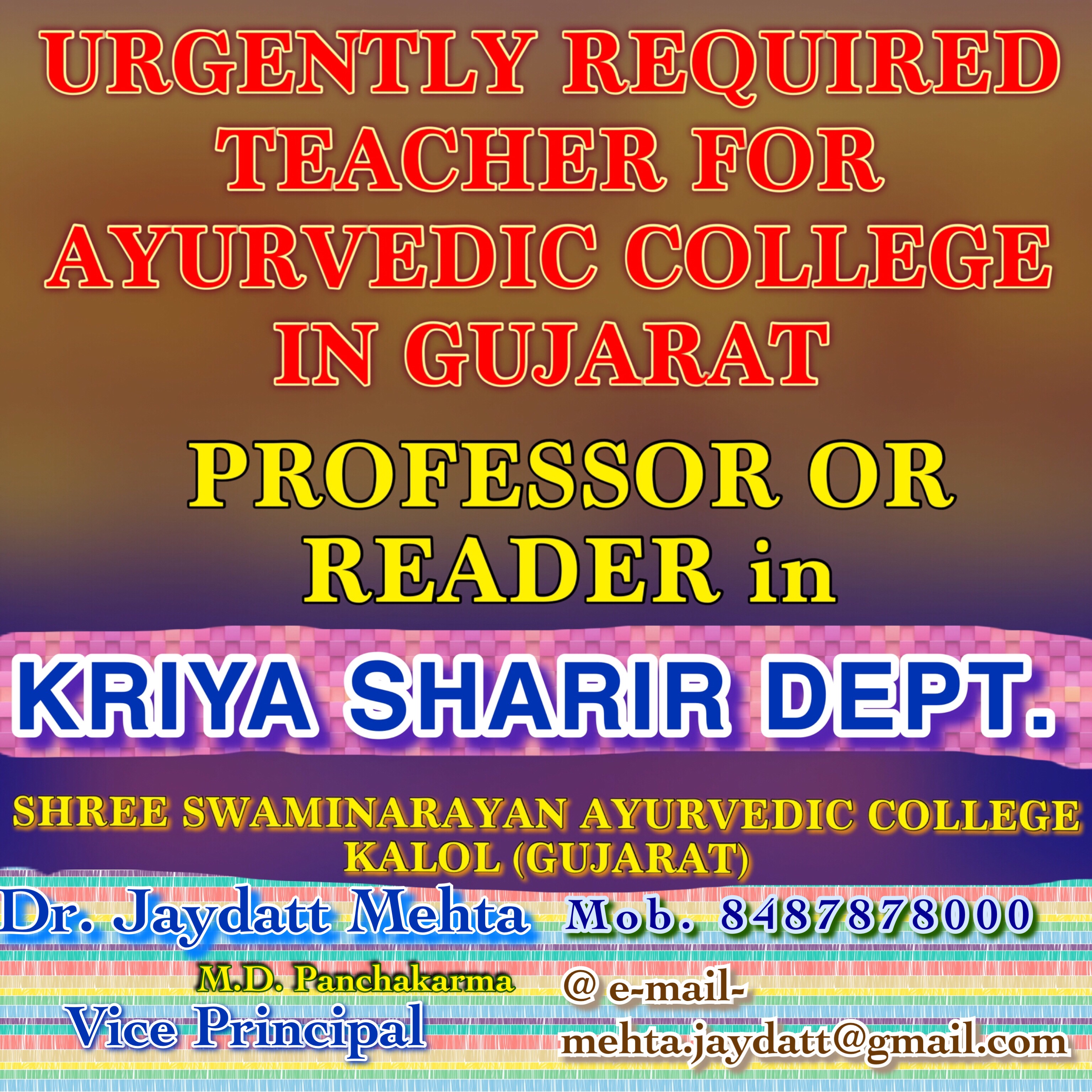 Vacancy for the post of Teaching Faculty at Shree Swaminarayan Ayurvedic College, Kalol, Gujarat.
