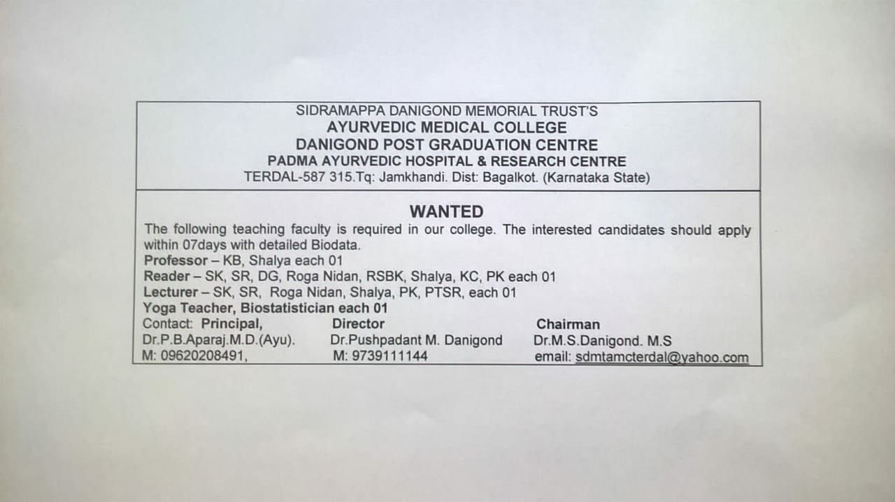 Vacancy for Various Posts at Sidramappa Danigond Memorial Trust's Danigond Ayurvedic Medical College, Karnataka.