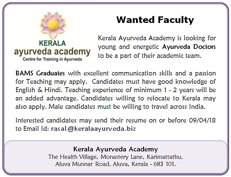 Vacancy for the post of Ayurveda Doctors at Kerala Ayurveda Academy, Kerala.