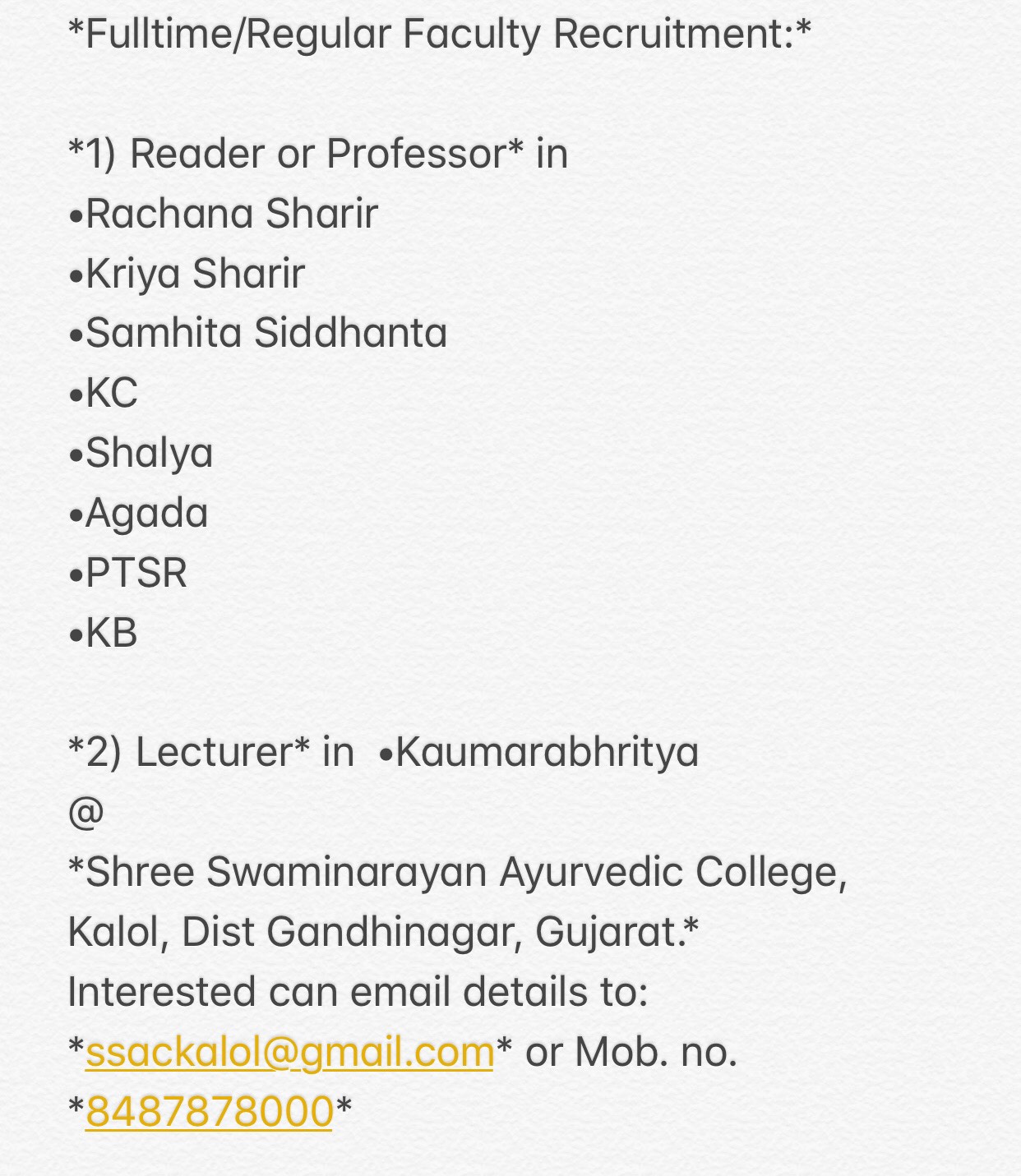 Vacancy for Various Faculty Posts at Shree Swaminarayan Ayurvedic College, Gujarat.