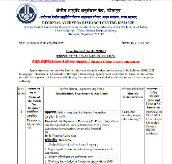 Online Interview for the post of Pharmacist (Ayurveda), Regional Ayurveda Research Centre, Dimapur.
