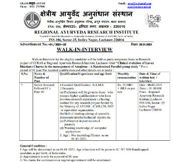 Walk-in interview for the post of Senior Research Fellow (AY.), Regional Ayurveda Research Institute, Lucknow.