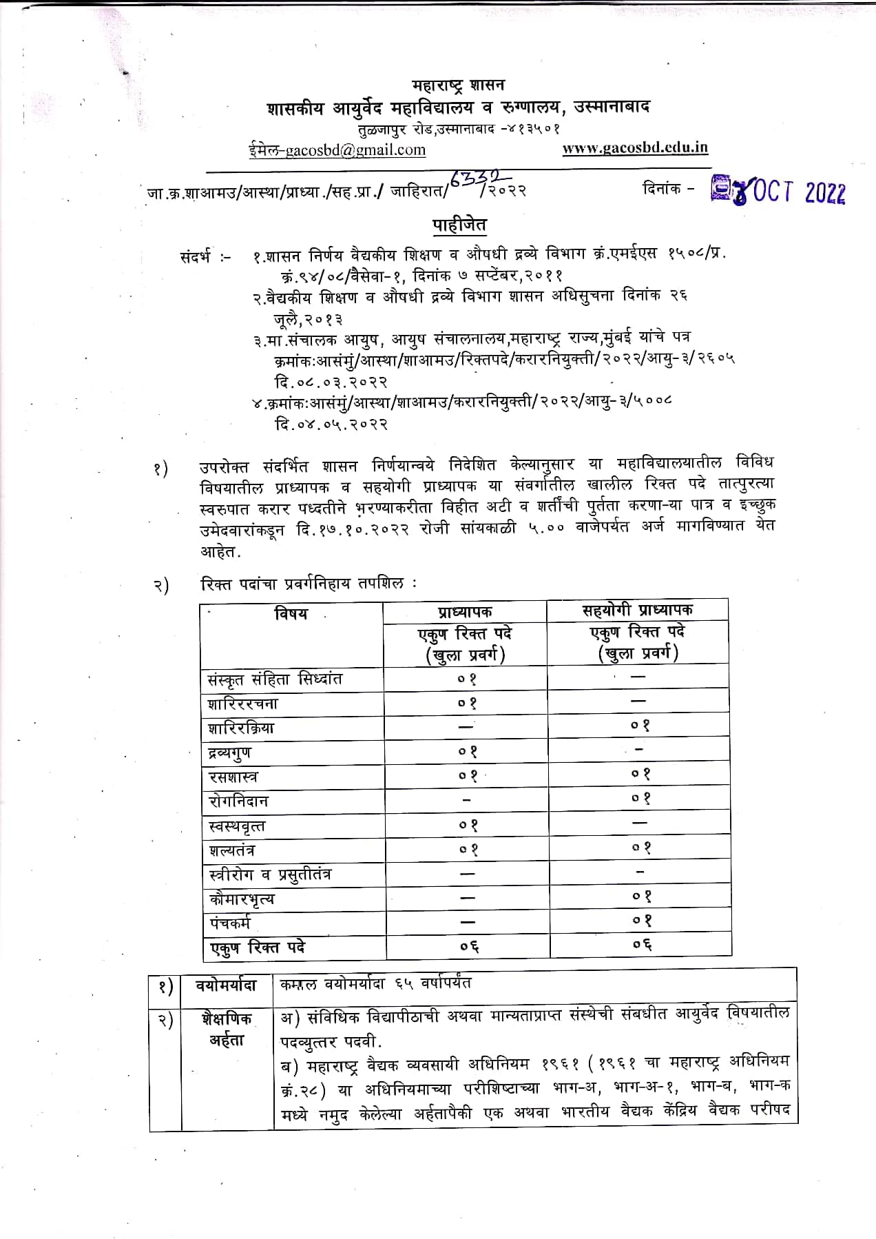 Vacancy For Teaching Faculty At Government Ayurved College Osmanabad