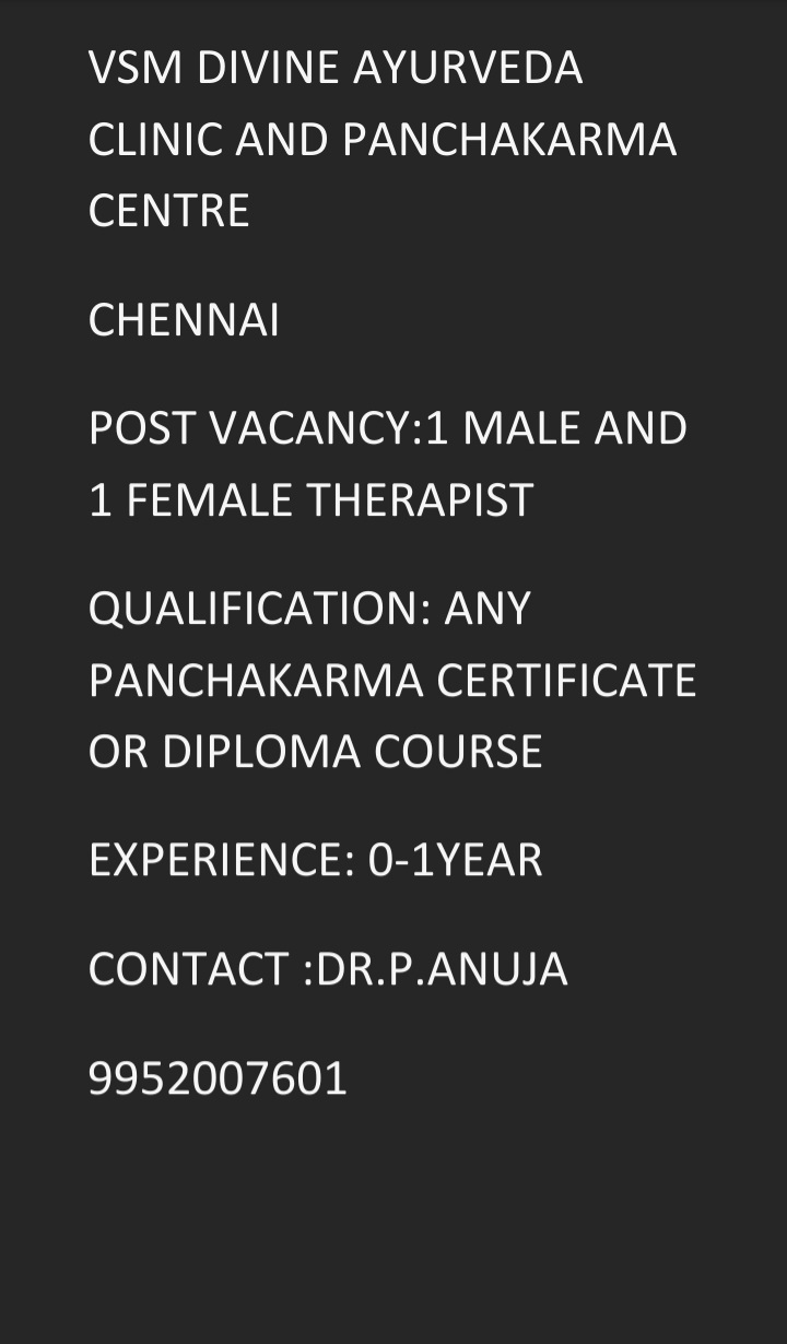 Vacancy For Therapist At VSM Divine Ayurveda Clinic And Panchakarma Center