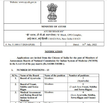 Vacancy for the post of Members, Ministry of Ayush, New Delhi.