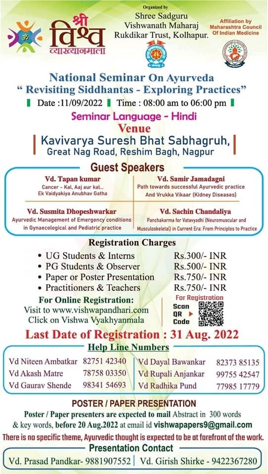 National Seminar on Ayurveda "Revisiting Siddhantas Exploring Practices, Organized at Kavivarya Suresh Bhat Subhagruh, Nagpur.