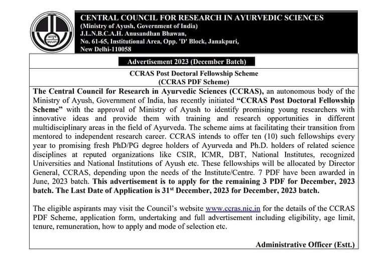 Admission Notice for Post Doctoral Fellowship Scheme,