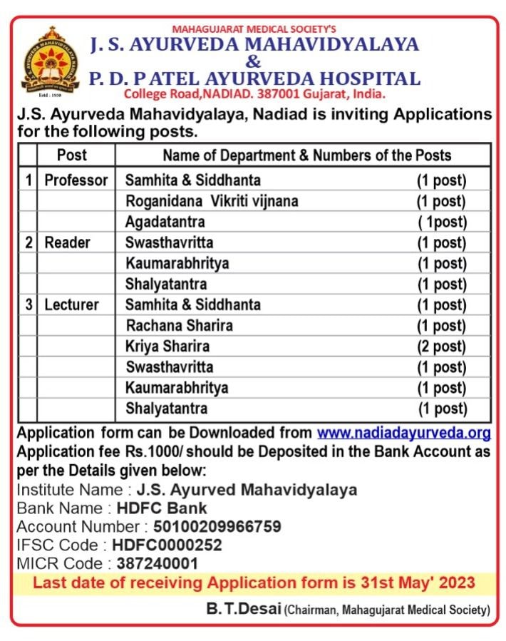 Vacancy For Professor, Reader, Lecturer At J S Ayurved Mahavidyalaya
