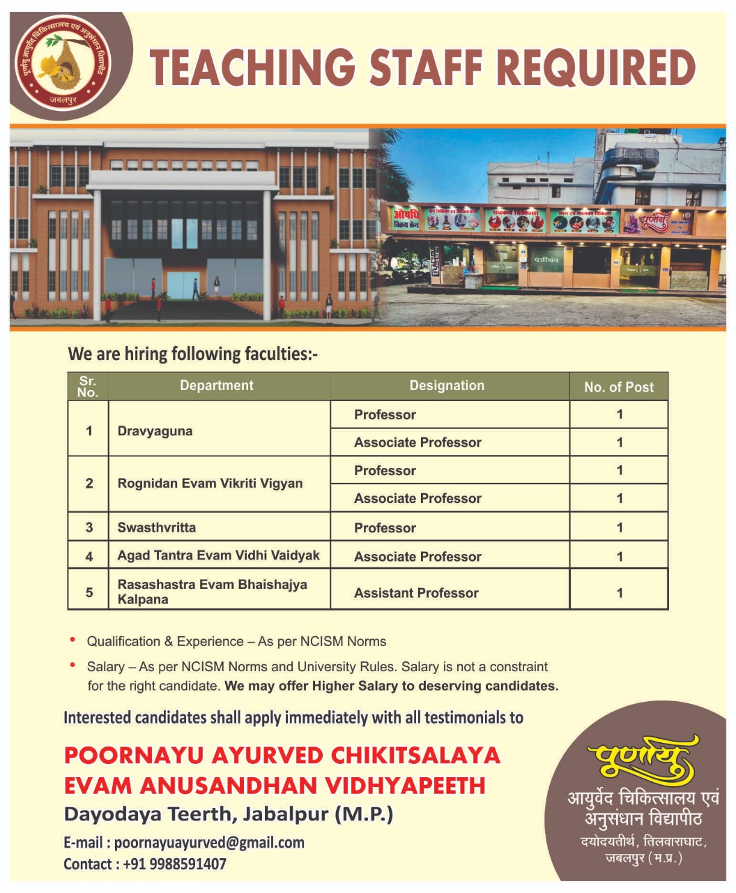 Vacancy For Teaching Staff At Poornayu Ayurved Chikitsalaya evam Anusandhan Vidyapeeth.