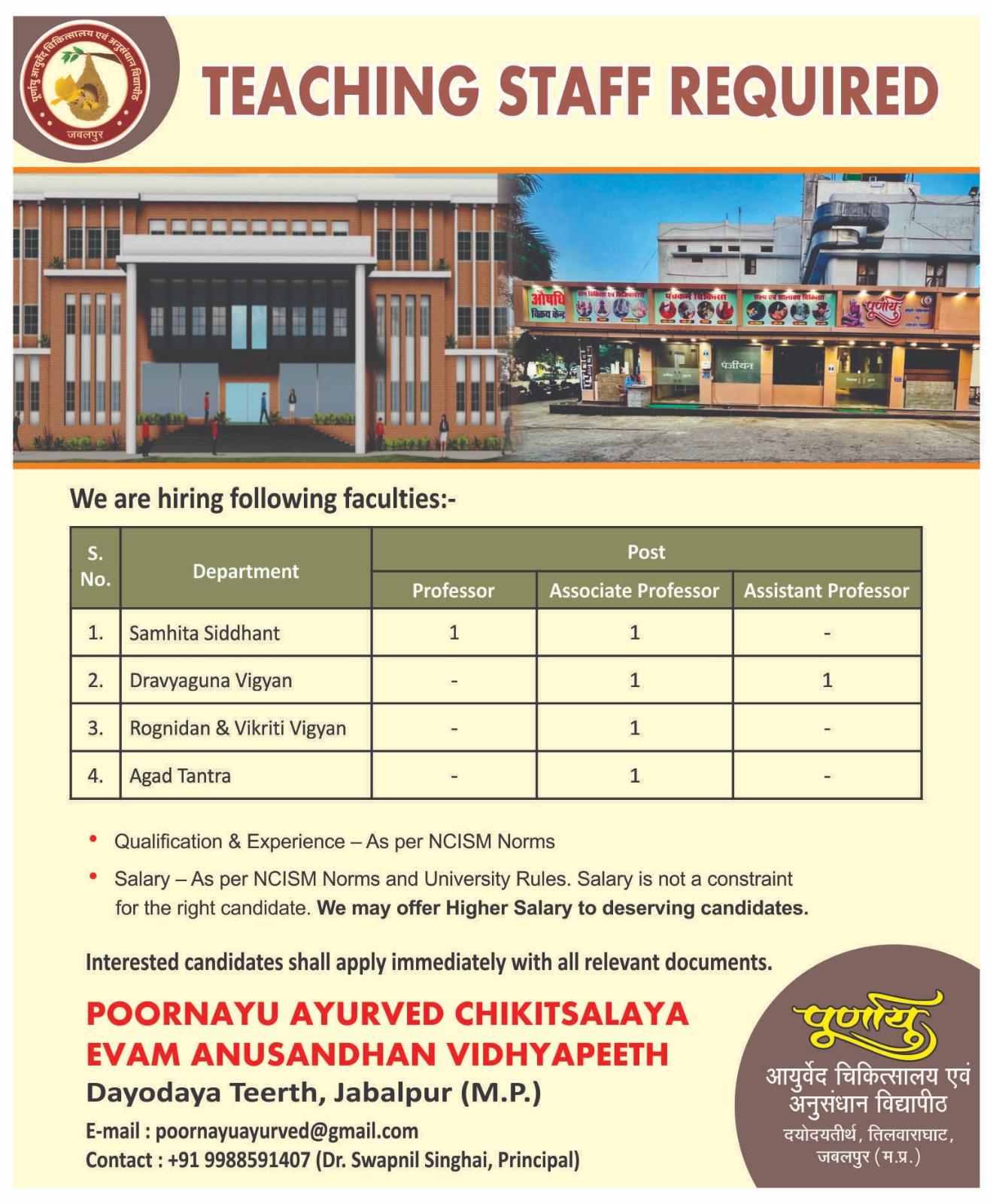 Vacancy For Teaching Staff At Poornayu Ayurved Chikitsalaya evam Anusandhan Vidyapeeth.