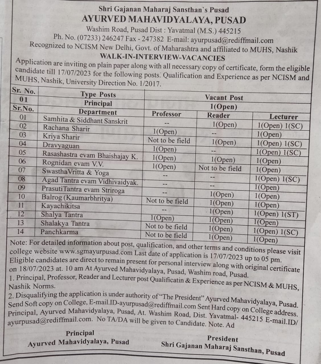 Vacancy For Various Ayur Posts At Ayurved Mahavidyalaya, Pusad