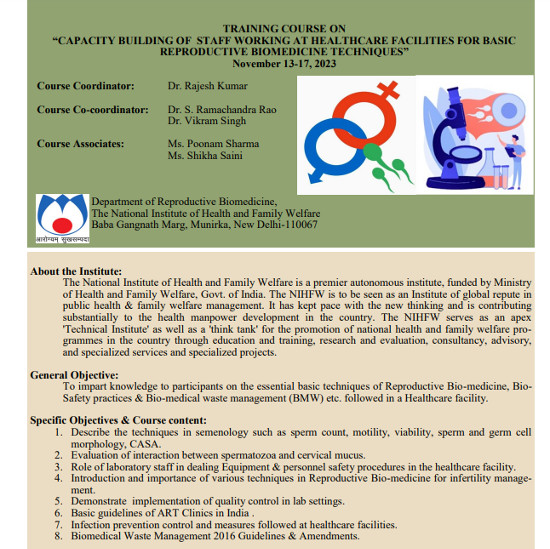 Training Course on "Capacity Building of Staff Working at Healthcare Facilities for Basic Reproductive Biomedicine Techniques", Organized by The National Institute of Health and Family Welfare, New Delhi.