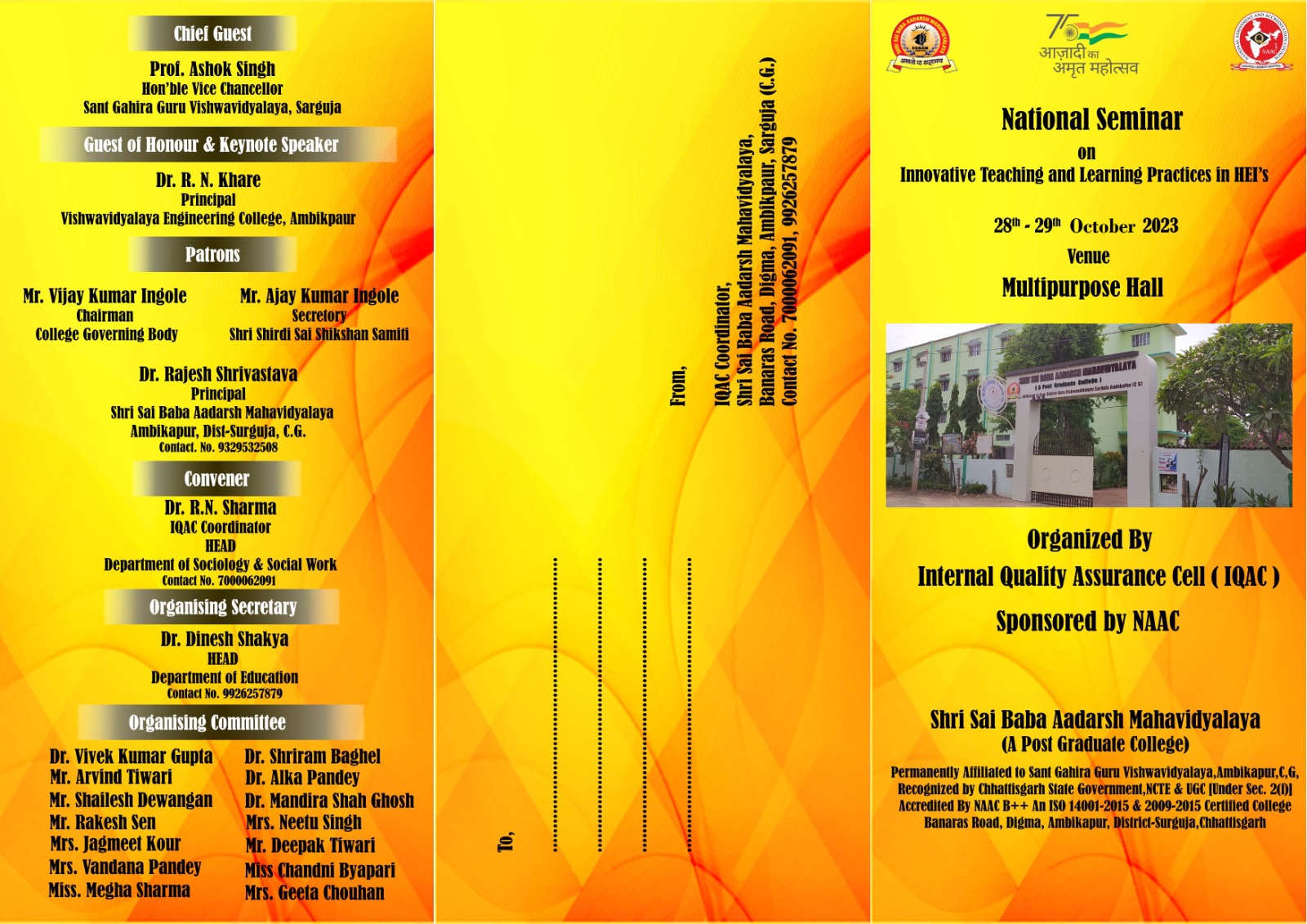 National Seminar on Innovative Teaching and Learning Practices in HEI's, Organized by Shri Sai Baba Aadarsh Mahavidyalaya, Chhattisgarh.