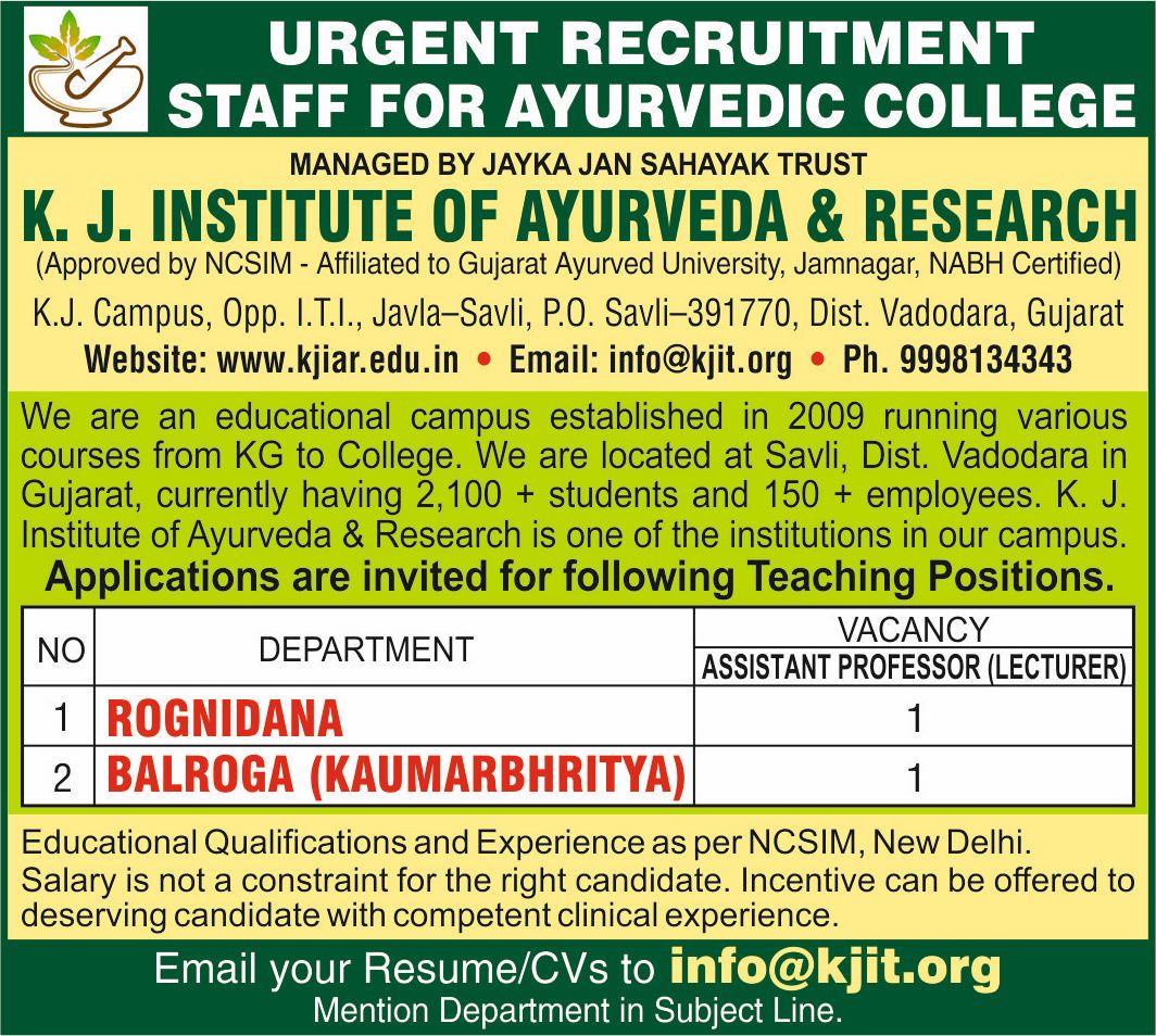 Vacancy For Assistant Professor At K. J. Institute of Ayurveda & Research