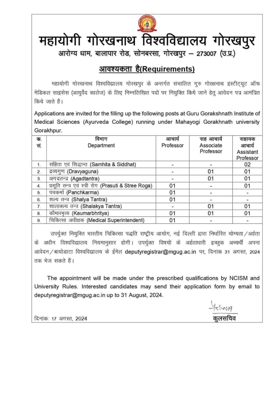 Vacancy For Professor, Associate Professor & Assistant Professor At GGIMS, Gorakhpur