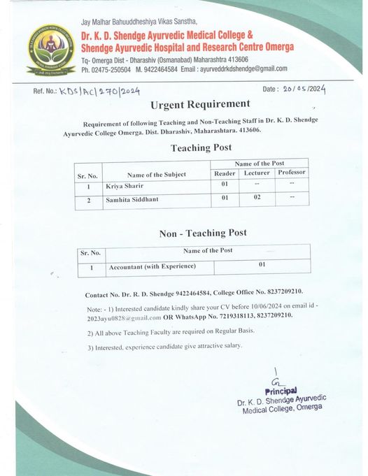 Vacancy For Teaching Faculty At Dr.K.D.Shendge Ayurvedic Medical College & Hospital,Omerga