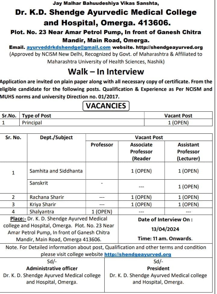 Vacancy For Various Ayur Posts At Dr.K.D.Shendge Ayurvedic Medical College & Hospital,Omerga