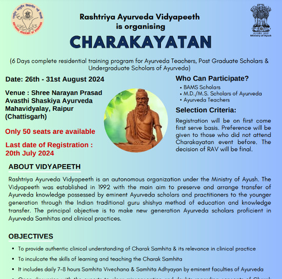 "CHARAKAYATAN": 6 Days Complete Residential Training Program for Ayurveda Teachers, Post Graduate Scholars & Undergraduate Scholars of Ayurveda, Organized by Rashtriya Ayurveda Vidyapeeth.