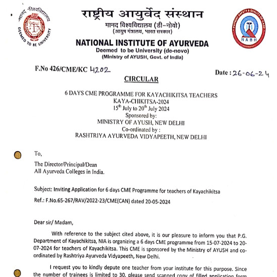 6 Days CME Programme for Kayachikitsa Teachers,
