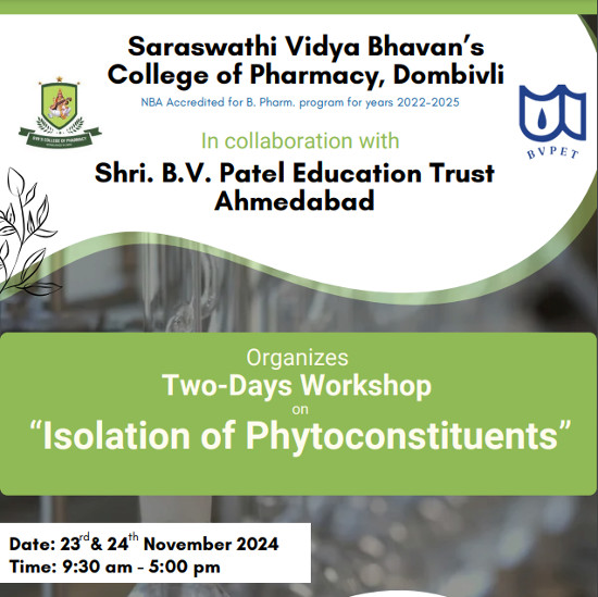 Two-Days Workshop on "Isolation of Phytoconstituents" Organized by Saraswathi Vidya Bhavan's College of Pharmacy, Dombivli.