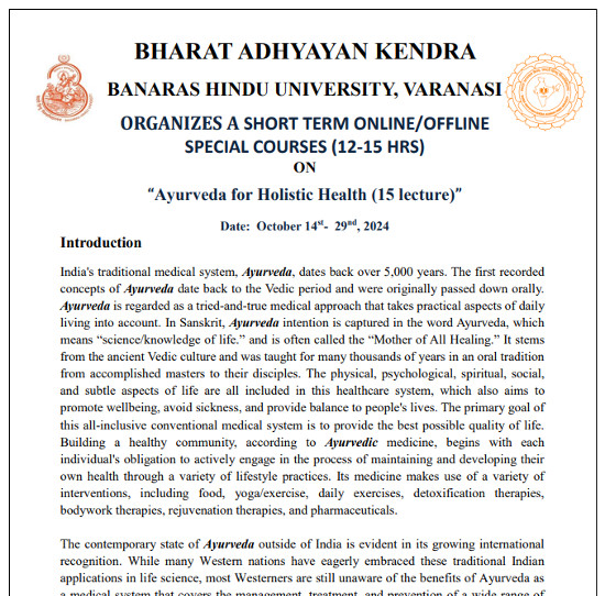Short term Online/ Offline course on "Ayurveda for Holistic Health" (15 Lecture), Organized by Banaras Hindu University, Varanasi.