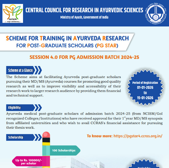Admission Notice for Scheme for Training in Ayurveda Research for Post - Graduate Scholars (PG - STAR), Central Council for Research in Ayurvedic Sciences, New Delhi.