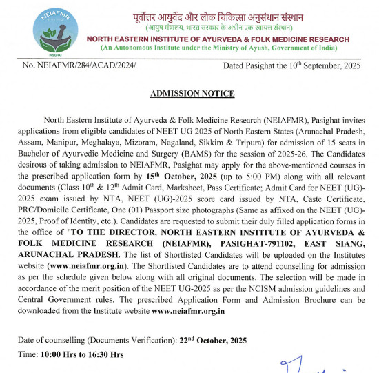 Admission Notice for Bachelor of Ayurvedic Medicine and Surgery (BAMS), North Eastern Institute of Ayurveda & Folk Medicine Research, Arunachal Pradesh.