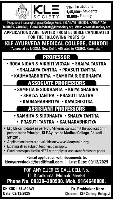 Faculty Recruitment 2025: Professor, Associate Professor & Assistant Professor Posts at KLE Ayurveda Medical College