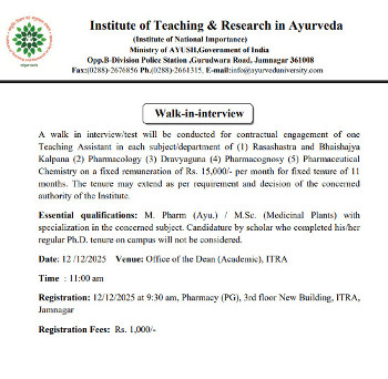 Walk-in Interview for the posts of Teaching Assistant, Institute of Teaching & Research in Ayurveda, Jamnagar.