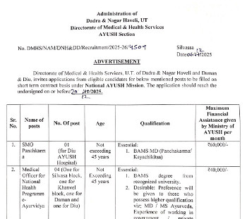 Vacancy for Various Ayurveda posts, National AYUSH Mission, Dadra & Nagar Haveli.