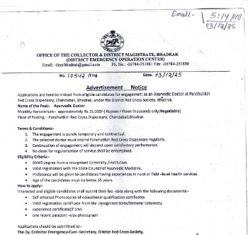 Vacancy for the post of Ayurvedic Doctor, Panchutikiri Red Cross Dispensary, Bhadrak.
