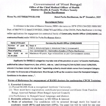 Vacancy for the post of Community Health Officer, National Health Mission, West Bengal.
