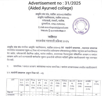 Vacancy for the post of Associate Professor and Assistant Professor, ASS Ayurved Mahavidyalaya, Nashik.